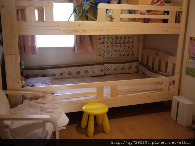 我們在台灣時,T先生就上網買了一個上下鋪,準備讓妹醬換大床,回到日本之後,妹醬馬上開開心心迎接她的大床,剛開始的2週,只要有客人來家裡,或是跟台灣的家人視訊,妹醬就要一直不停地介紹她的新床舖,整個非常興奮!